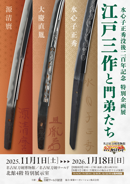 新々刀の祖・水心子正秀の没後200年を記念し、「江戸三作」と称される水心子正秀、大慶直胤、源清麿、そしてその一門による傑作刀剣の数々を一堂に集めてご紹介します。